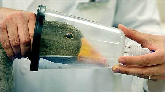 Boswell, a 2-year-old goose undergoing cancer treatment at the Cummings School of Veterinary Medicine at Tufts University in North Grafton. Though he was an $8 purchase at the local feed store, his two major bouts with cancer - a tumor in his trachea and now osteosarcoma (a fast-moving and painful bone cancer) in his leg - have added up to perhaps $20,000 worth of surgeries and treatments.)