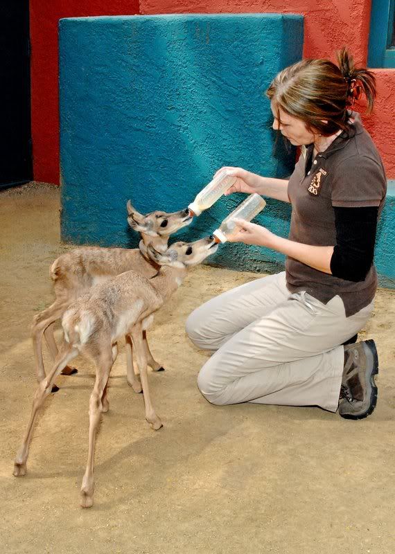 Two male peninsular pronghorns were born at the L.A. Zoo on March 25, 2008. These fawns are the first of their kind ever born at a Zoo. According to Senior Animal Keeper Kelley Greene, “the brothers have been pulled for hand rearing to ensure that they are given every opportunity to thrive.” When the pair is old enough, they will be sent to the Living Desert in Coachella Valley, Calif.